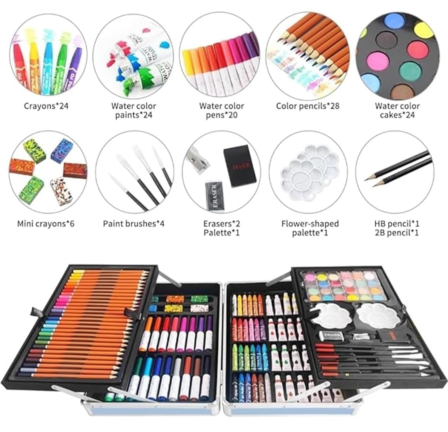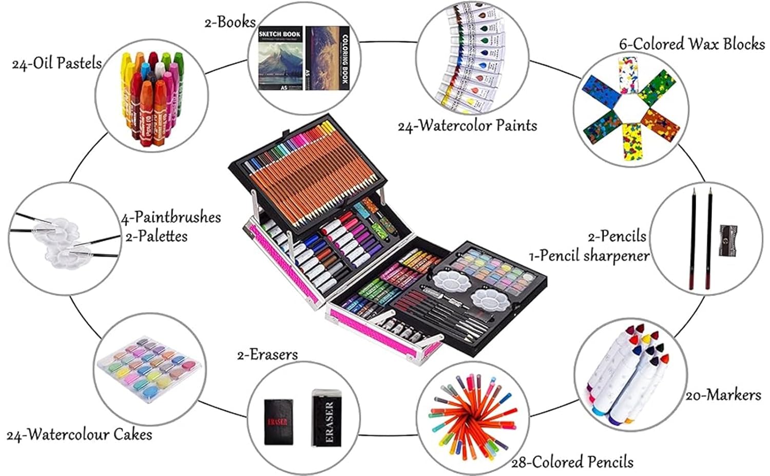 - Includes crayons, markers, colored pencils, paints, brushes, and more.