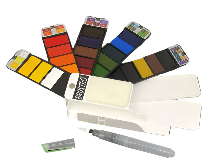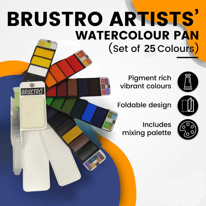 BRUSTRO Artists Watercolour Travel Pan | Set of 25 Colours | Foldable (Includes Mixing Palette)