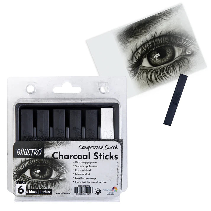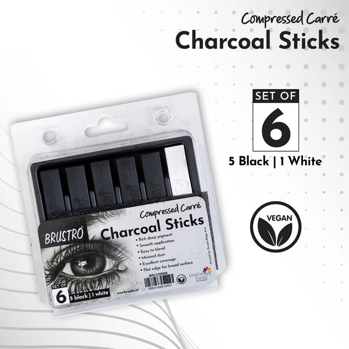 BRUSTRO Compressed Charcoal Sticks - Set of 6 (5 Black & 1 White Stick)